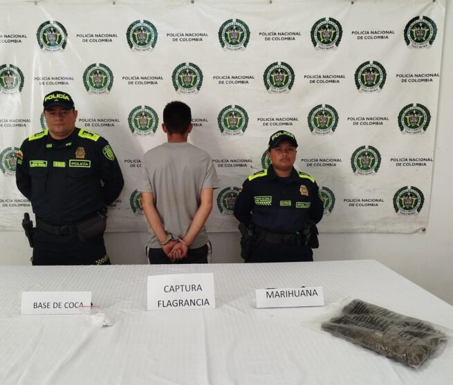 Con el propósito de contrarrestar la comercialización de sustancias psicoactivas, la Policía Nacional, a través de uniformados adscritos al Modelo del Servicio de Policía, logró la captura en flagrancia de un hombre de 23 años de edad por el delito de tráfico, fabricación o porte de estupefacientes.